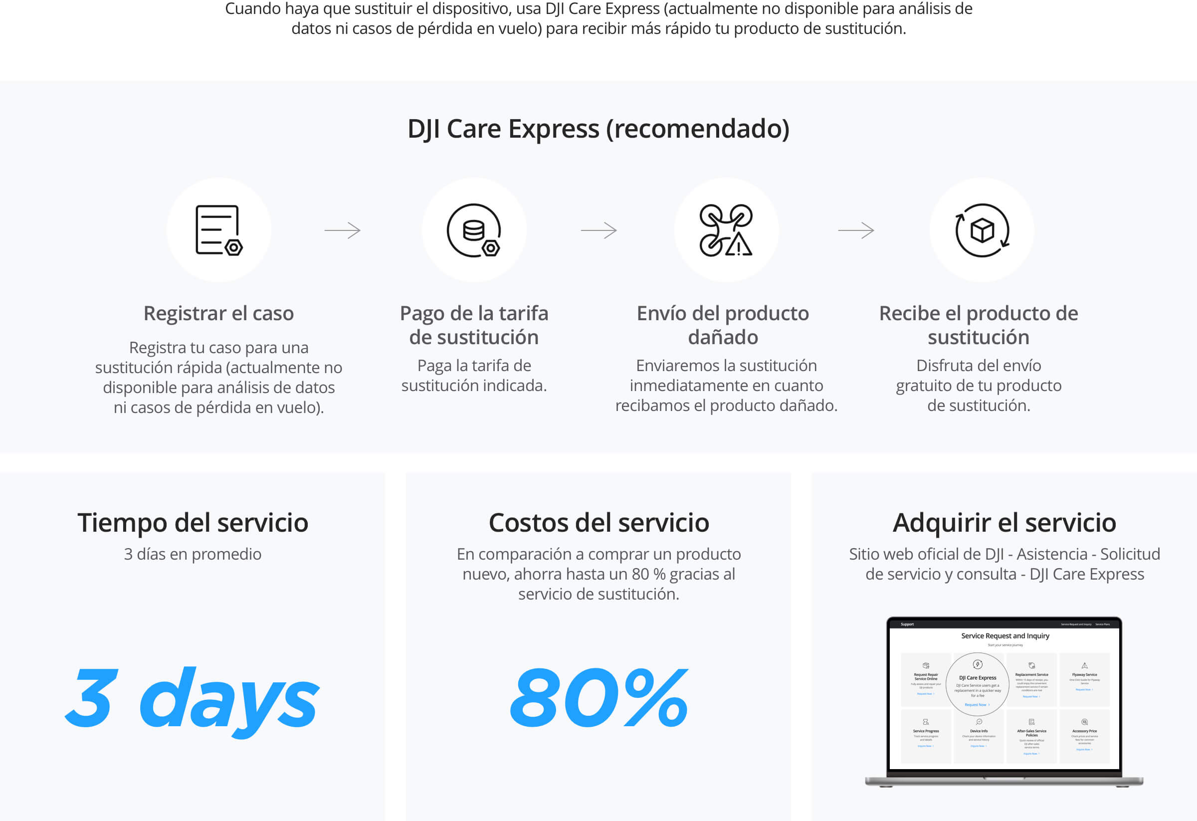 Tras adquirir DJI Care, se enviará a tu correo electrónico el acuerdo de servicio del producto. Consulta información detallada sobre las ventajas y la cobertura en el acuerdo de servicio.